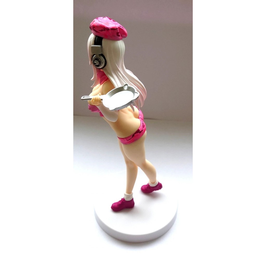 In the box: 1 x Super Sonico Action Figure, 1 x removable frying pan decoration that fits into her hand and 1 x stand that the bottom of Super Sonico's foot fits into as the photos show.
